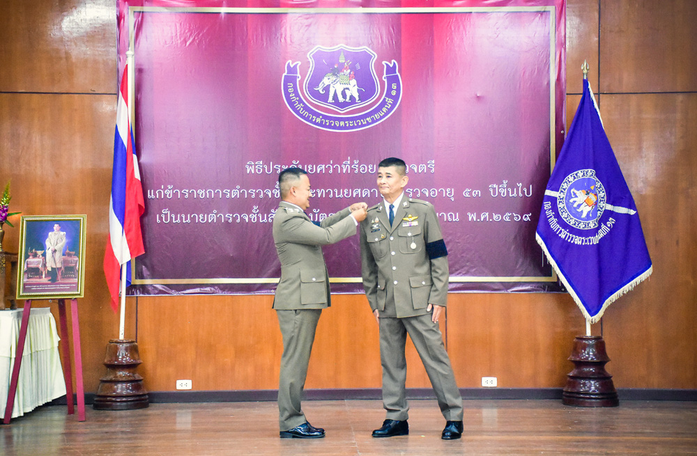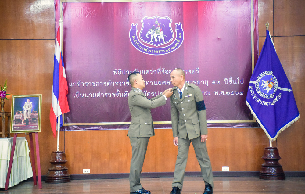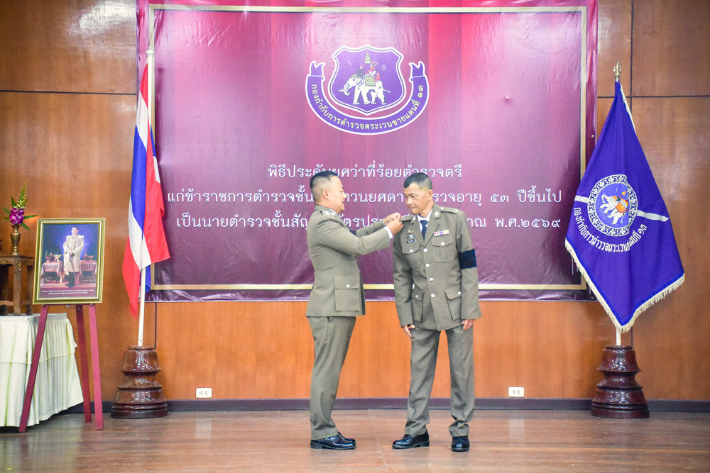 เมื่อ ๑๖ เม.ย.๖๙ เวลา ๐๙.๐๐ น. ว่าที่ พ.ต.อ.ธวัลธรณ์ พุฒิธนพิศุทธิ์ ผกก.ตชด.๑๓ เป็นประธาน พิธีประดับยศว่าที่ร้อยตำรวจตรี
